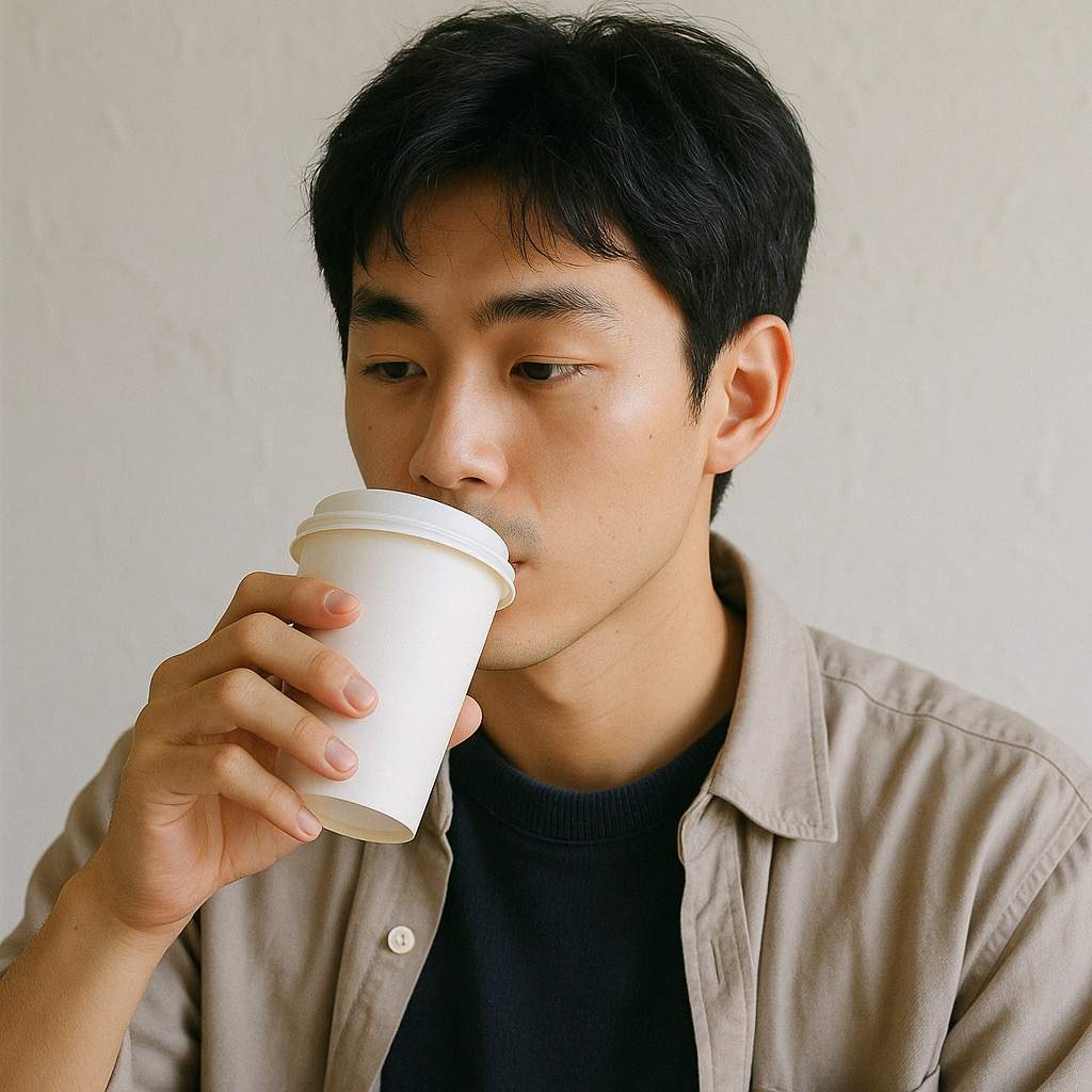 "text": "生成男生举着咖啡,并且马上要喝的样子"