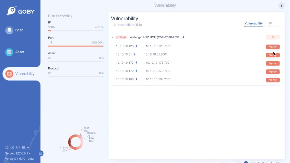 Goby 是一款轻量的漏洞扫描工具,主打快速的系统漏洞探测,我们可以用它快速扫描目标的系统漏洞:
