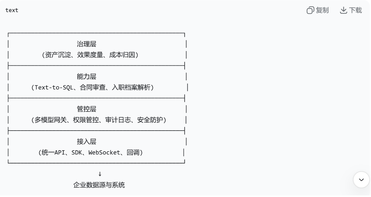 | AI底座 | 承载所有AI能力的平台层 | 统一、可管、可演进 |