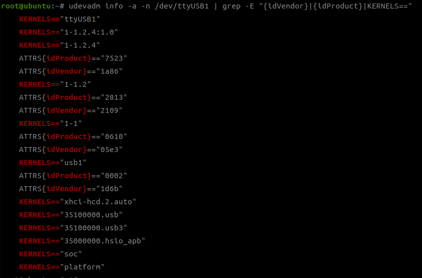 udevadm info -a -n /dev/ttyUSB1 | grep -E "{idVendor}|{idProduct}|KERNELS=="