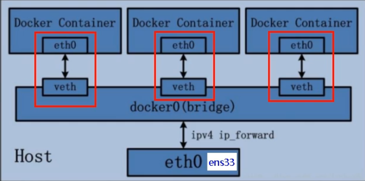 docker0网桥(如veth123456) - 另一端放入容器 namespace(重命名为