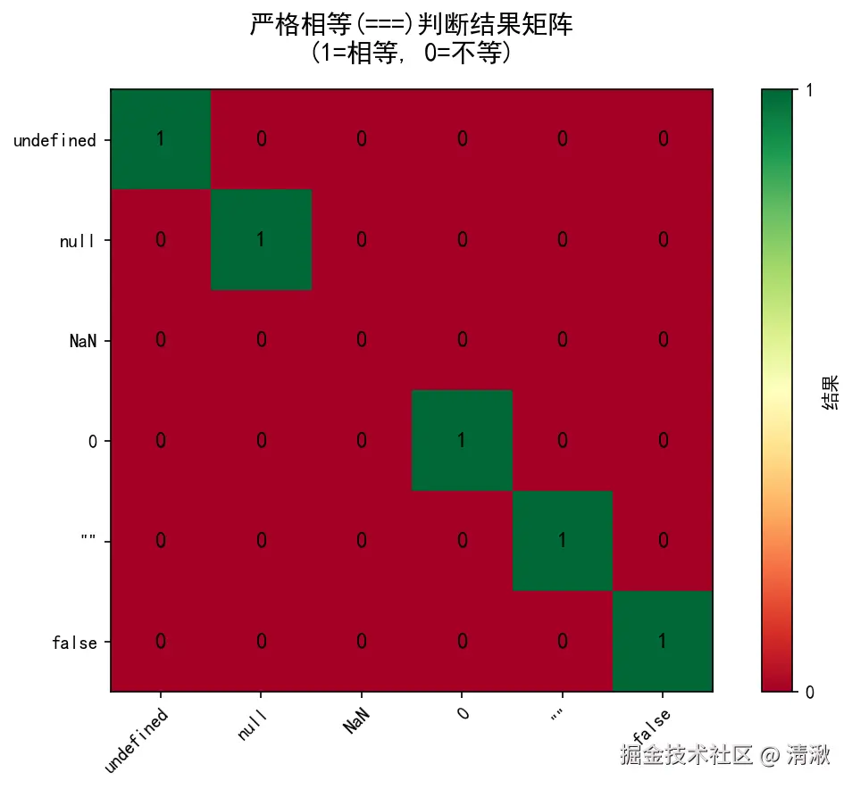 下面的矩阵图展示了在严格相等(===)下,各个特殊值之间的比较结果:
