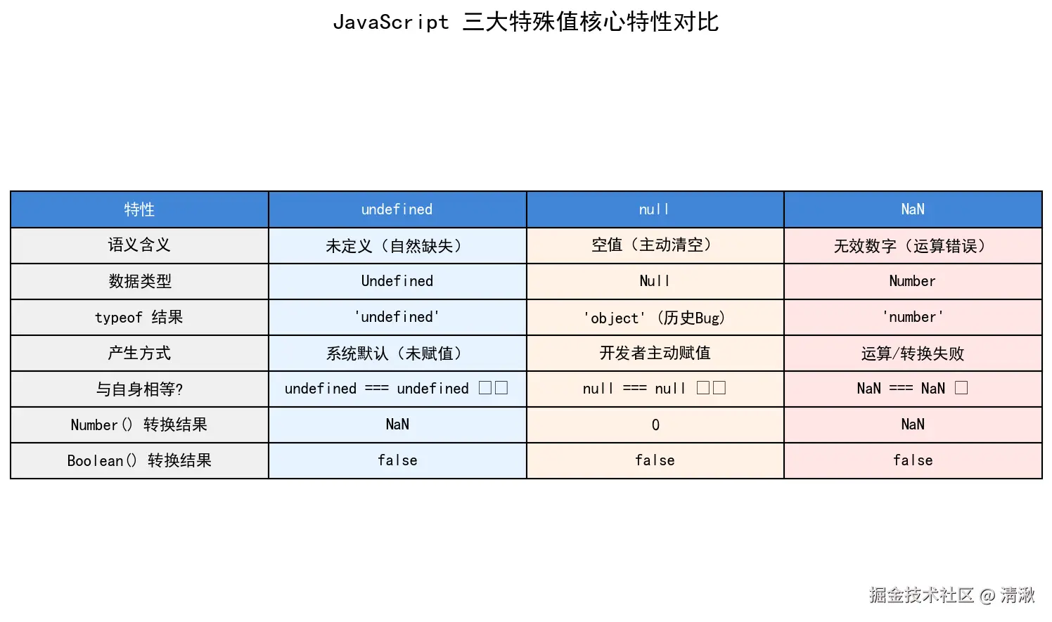 从表中可以清晰地看到,虽然它们在布尔转换中都为 false,但在类型、语义和转换行为上完全不同。