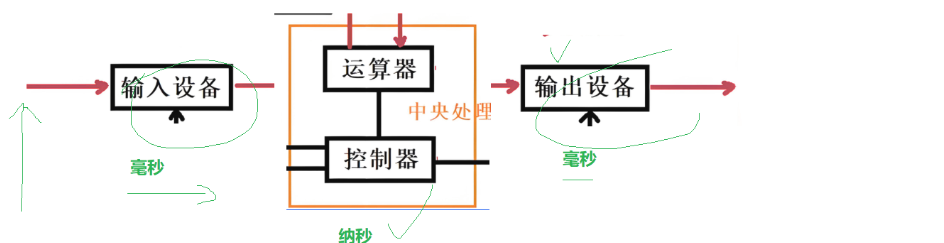 当外设把数据给cpu后,cpu快速处理就给输出设备,但输出设备输出慢,cpu就得等着输出设备把数据处理好后再能把数据给输出设备,同样输入设备慢cpu又不能及时获得数据。那么整体体系效率就由外设设备来定了