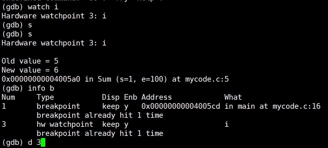 执⾏时监视⼀个表达式(如变量)的值。如果监视的表达式在程序运⾏期间的值发⽣变化,GDB会暂 停程序的执⾏,并通知使⽤者(和断点删除方式一样)