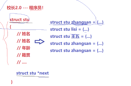 结构体存放*next,形成链表