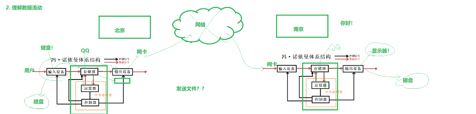当我们登录qq就是把qq的执行程序加载到内存,在我们从键盘输入我们要发的消息时,数据由输入设备流向内存,与cpu做加密和封包等操作,再返回给内存,最后数据到输出设备(网卡)通过网路发送到对方的输入设备(网卡)接受,再到内存和运cpu做解密等操作后流向输出设备(显示器)上显示出来。