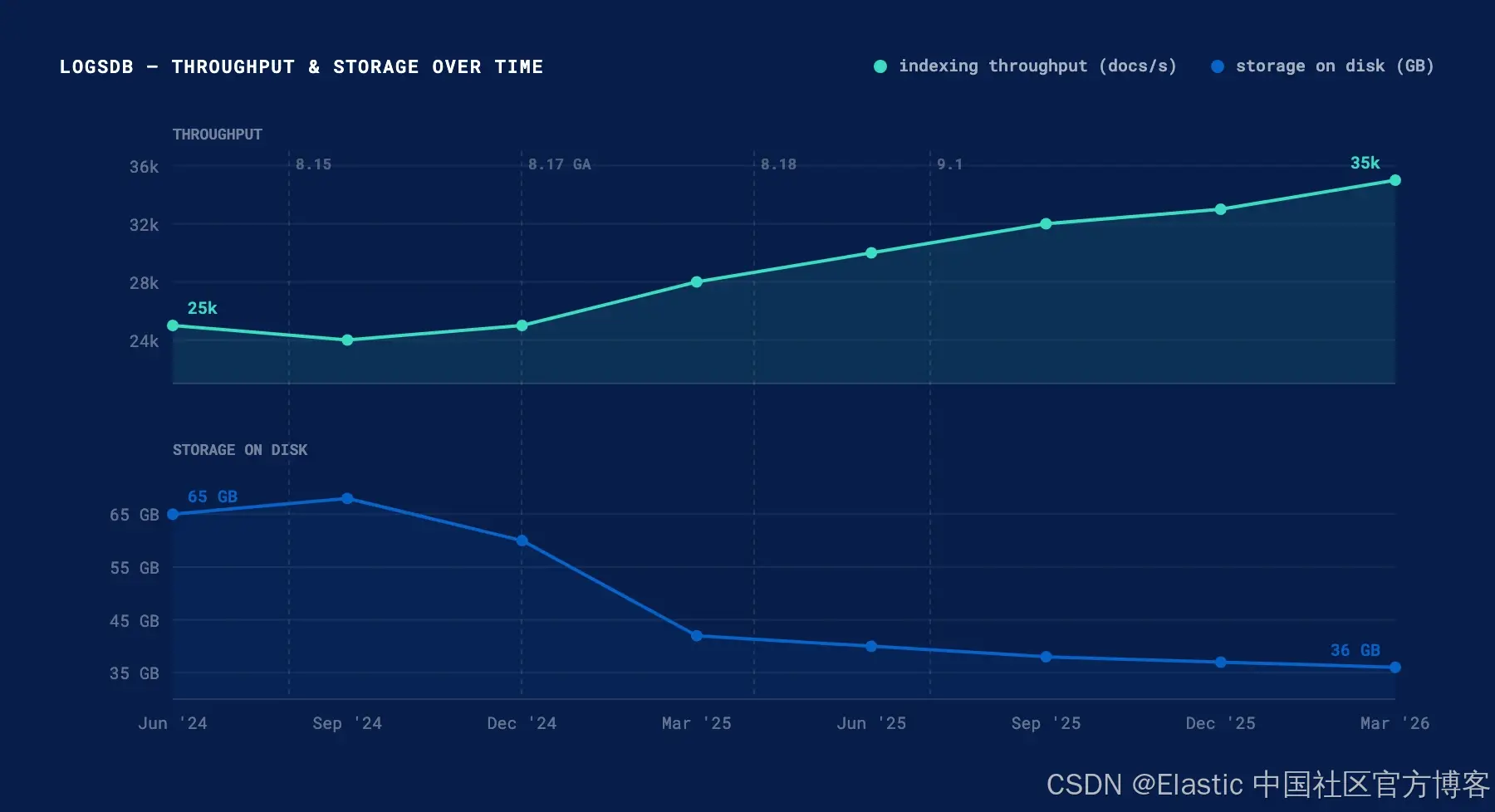吞吐量(teal)从技术预览阶段的约 25k 提升到约 35k docs/s。磁盘存储(blue)在同一基准数据集上从约 65 GB 降至约 36 GB。两条曲线都在朝正确方向变化,这些改进来自同一套分层发布:8.16 的 ZSTD、8.18 的路由优化,以及 9.1 的 merge 与 recovery 重构。实时数据可见于 elasticsearch-benchmarks.elastic.co。