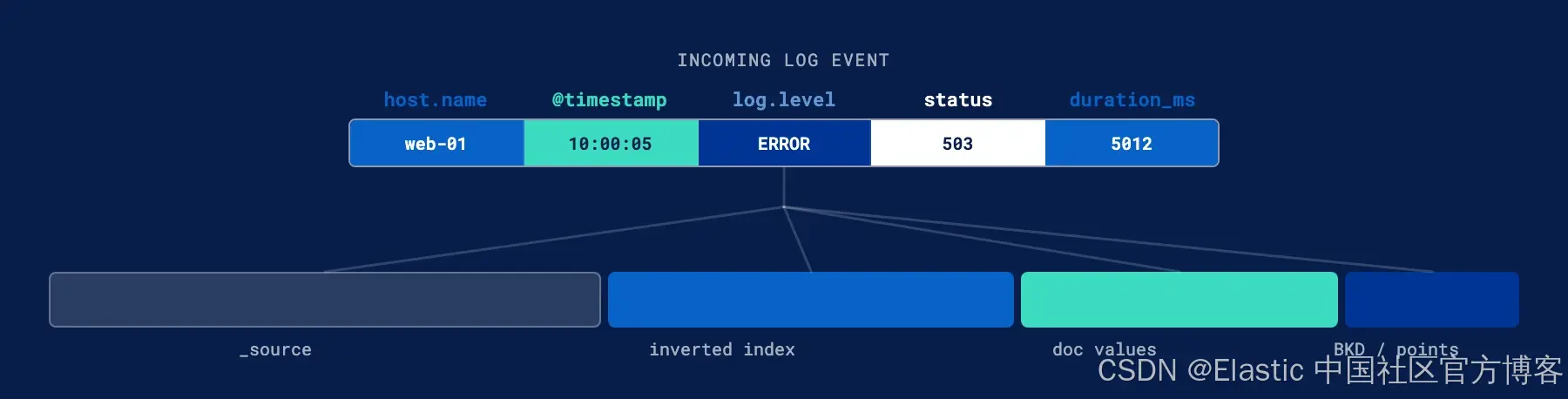 以一个日志事件为例,字段包括 host.name 、 @timestamp 、 http.response.status_code 和 duration_ms 。整个事件会以 JSON 形式序列化存入 _source 。同样的字段值也会被写入 doc values 列、倒排索引结构,以及 BKD tree 用于范围查询。相同的数据,被写入多个结构,并各自占用磁盘空间。