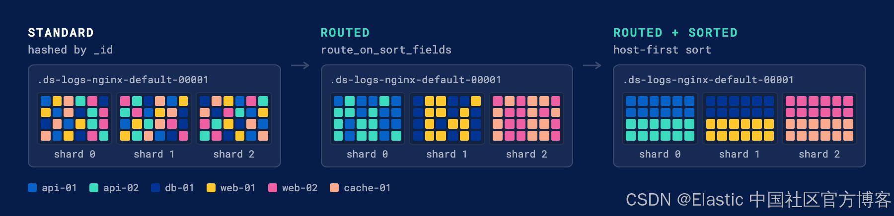数据流 .ds-logs-nginx-default-00001 包含六个主机,分布在三个分片上。STANDARD(按 _id 哈希):所有 host 的颜色随机分散。ROUTED(route_on_sort_fields):相同 host 的日志会落在同一个 shard,但在 shard 内仍保持到达顺序。ROUTED + SORTED(host-first sort):每个 shard 内包含单一 host 的连续块------这是让数值 codec 和 RLE 发挥全部潜力的组合方式。