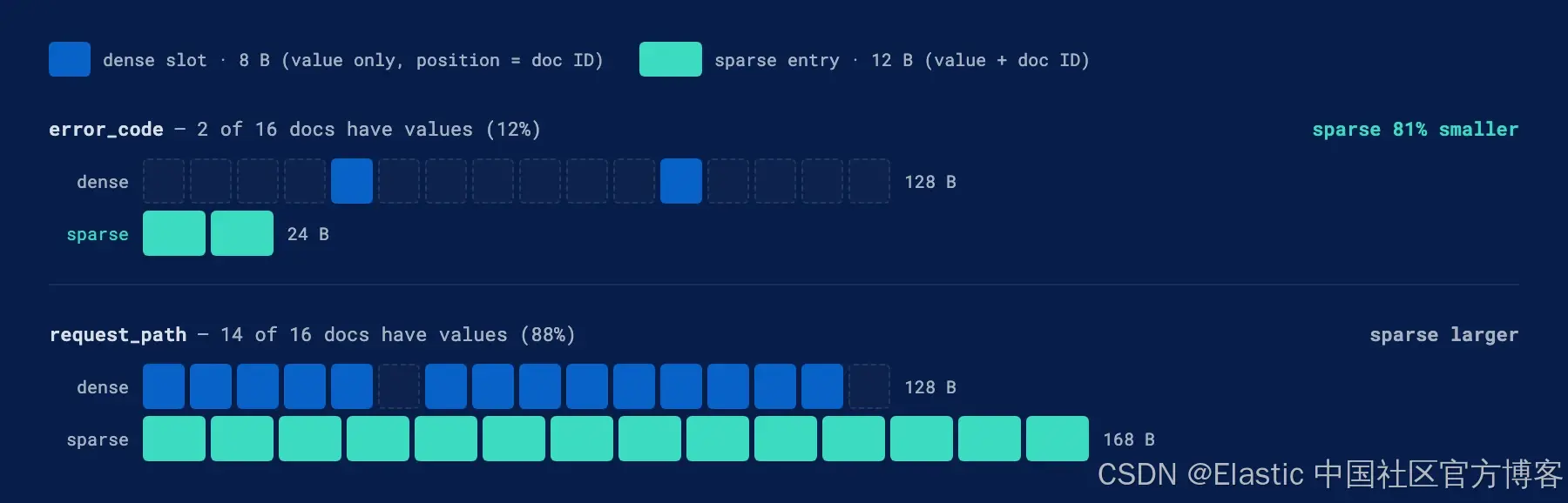 Dense encoding 为每个文档预留一个 8-byte 的槽位,无论是否存在值。Sparse encoding 只存储实际有值的文档,每个条目 12 bytes(value + doc ID)。对于 error_code ,在 16 个文档中只有 2 个有值(12% 填充率),sparse 要小 81%:24 B vs 128 B。对于 request_path ,填充率 88% 时,sparse 反而更大:168 B vs 128 B。Lucene 按字段选择策略;在低于约 67% 填充率时,sparse 会胜出。
