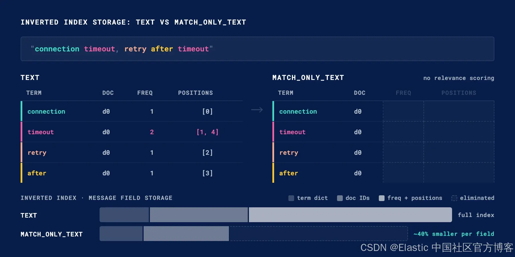 text 会为每个 term 存储其出现频率以及它出现的所有位置。match_only_text 只保留 doc IDs------足以找到文档,其它信息全部省略。timeout 这个词在这条消息中出现了两次(位置 1 和 4),这正是会被丢弃的数据类型。