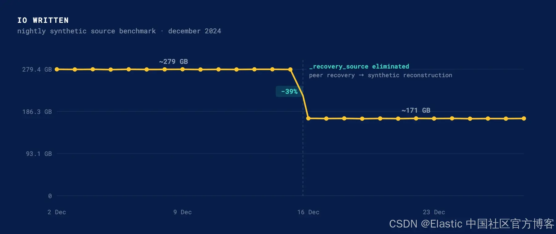2024 年 12 月的 nightly synthetic source 基准测试。索引写入大小下降 39% ------ 从约 279 GB 降至 171 GB ------ 这一变化发生在 peer recovery 从复制原始 _recovery_source blob 切换为基于 doc values 重建文档的当天。