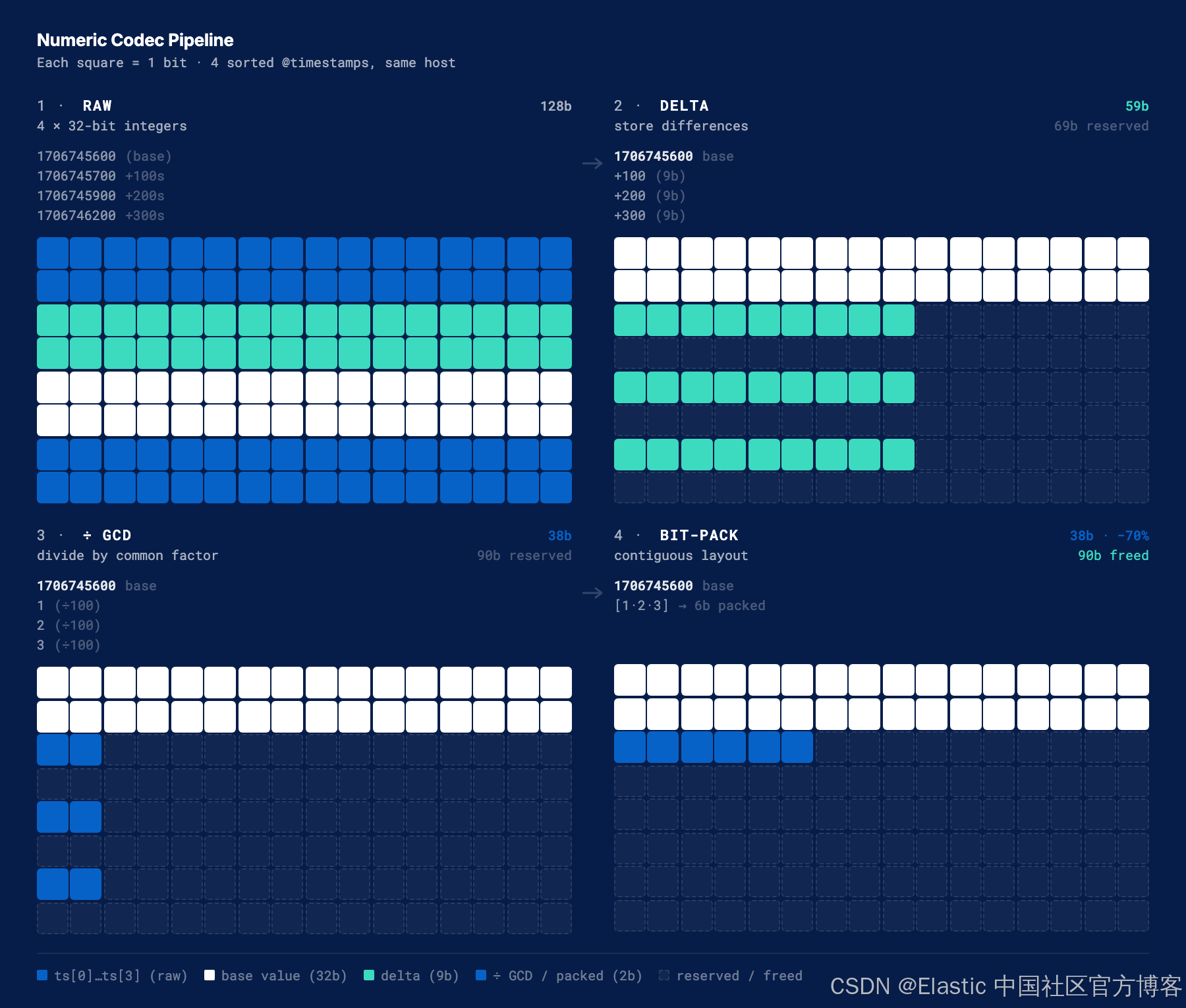 现在假设在写入 segment 之前,按照 host.name 和 @timestamp 进行排序。这样同一 host-A 的日志会连续写在一起,然后是 host-B,以此类推。在每个 host 的连续区间内,时间戳是单调递增的,因此 delta 是可预测的。