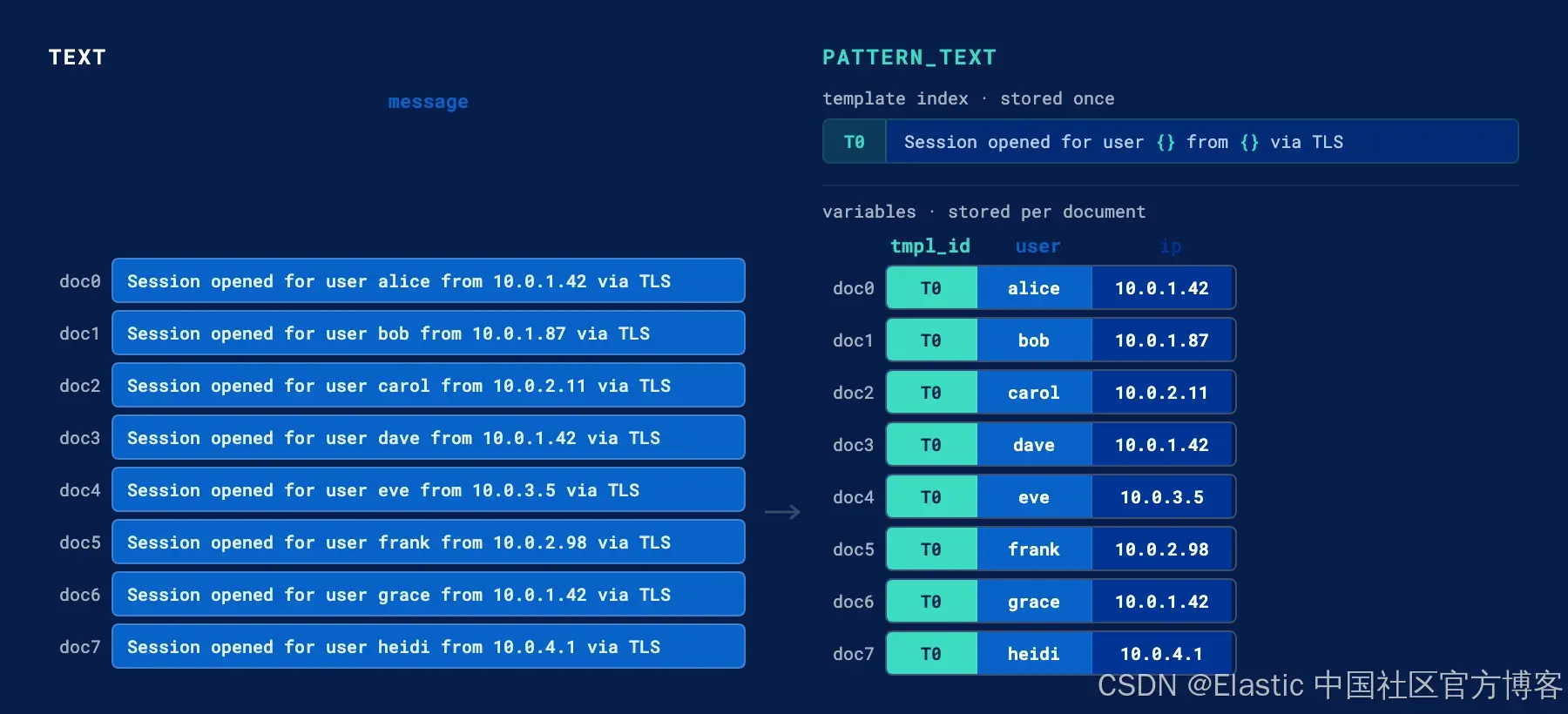 TEXT 将每条日志消息作为每个文档的完整字符串存储 ------ 八份几乎相同的 blob。PATTERN_TEXT 将其拆解:共享模板 Session opened for user {} from {} via TLS 只存储一次并分配 ID T0,而仅将变量列(user、ip)按文档存储------alice/10.0.1.42、bob/10.0.1.87、carol/10.0.2.11,依此类推。