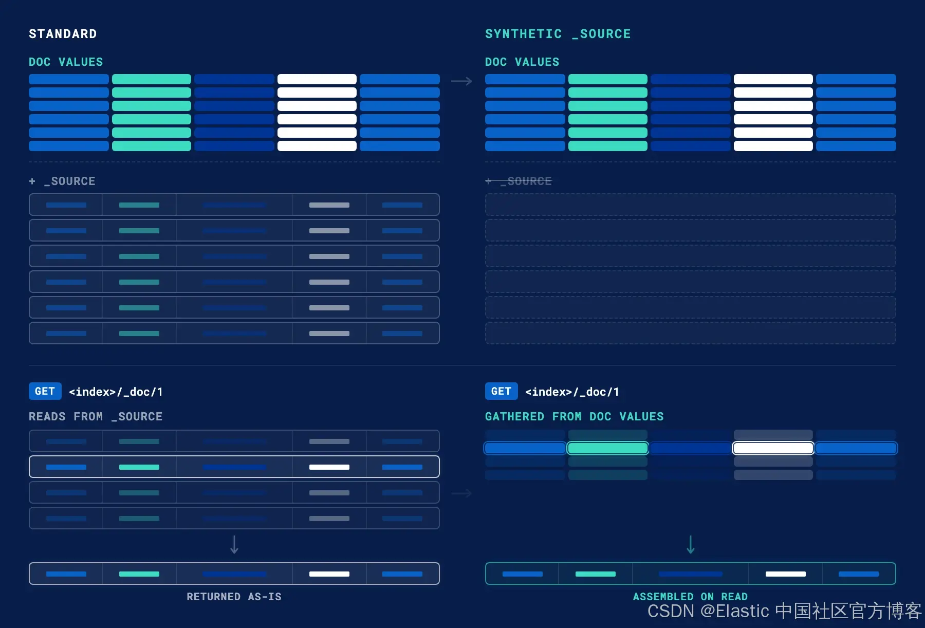没有 LogsDB 时,Elasticsearch 会为每条日志事件写入两次:一次作为磁盘上的原始 _source blob,一次写入 doc values 列。LogsDB 则完全跳过这个 blob。在读取时,一个 GET /_doc/1 请求会从 doc values 中收集字段值,并在运行时重新组装成完整文档。