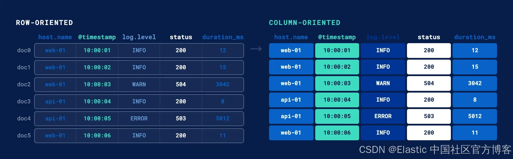 行式的 _source 将每个文档的所有字段放在一个 blob 中 ------ doc0 到 doc5 每个都把 host.name 、 @timestamp 、 status 、 duration_ms 等字段混杂在一起存储。列式的 doc values 则重新组织这些数据,使所有 host.name 的值放在一列中,所有时间戳放在另一列中,所有状态码放在另一列中。然后压缩编码可以在每个连续的列上独立运行。