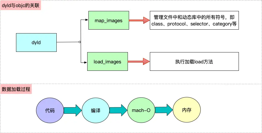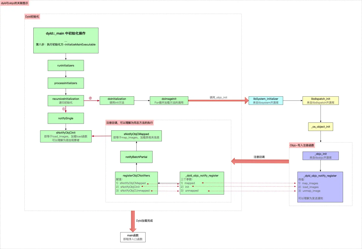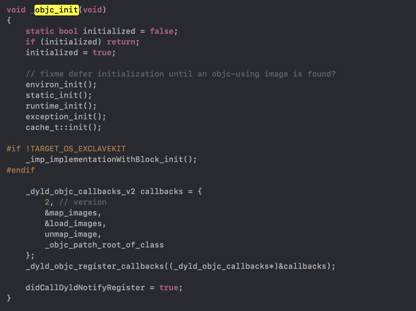 libSystem初始化libSystem很早就调用_objc_init()_objc_init()里把 ObjC runtime 先启动起来,并向 dyld 注册 image 回调- 之后dyld 再继续走库初始化、静态构造器、image 通知、