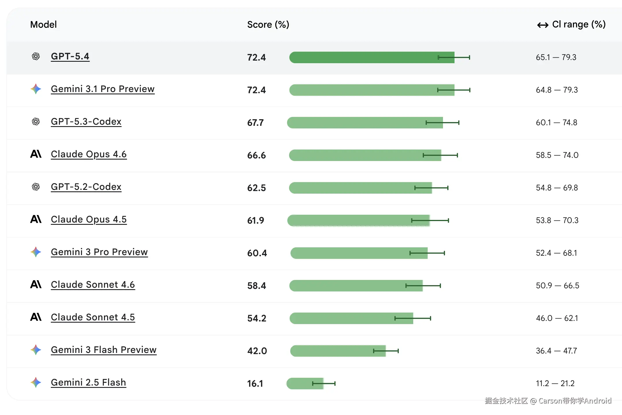 - 第一梯队(65%+):GPT-5.4、Gemini 3.1 Pro、GPT-5.3-Codex、Claude Opus 4.6