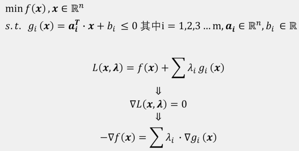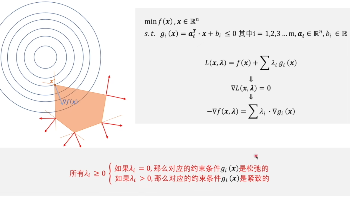 其核心关键就是梯度为0,即什么时候存在最值?当朗格朗日函数的整体梯度为0时,出现最值。那朗格朗日函数的整体梯度为0时,会出现什么情况?