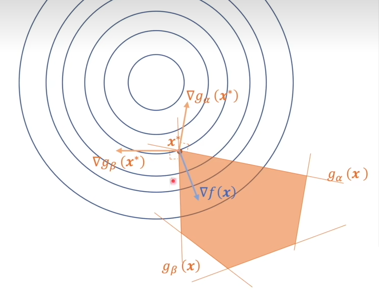 由上面式子可知,当2个梯度的和为0时,整体梯度为0。则就要求原函数图像与条件函数的梯度出现等大反向共线时才能满足。