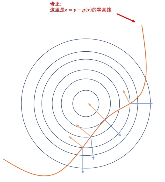 蓝色线表示原函数图像,黄色线表示条件函数图像。当二者出现相切时,才满足整体梯度为0,此时出现最值。