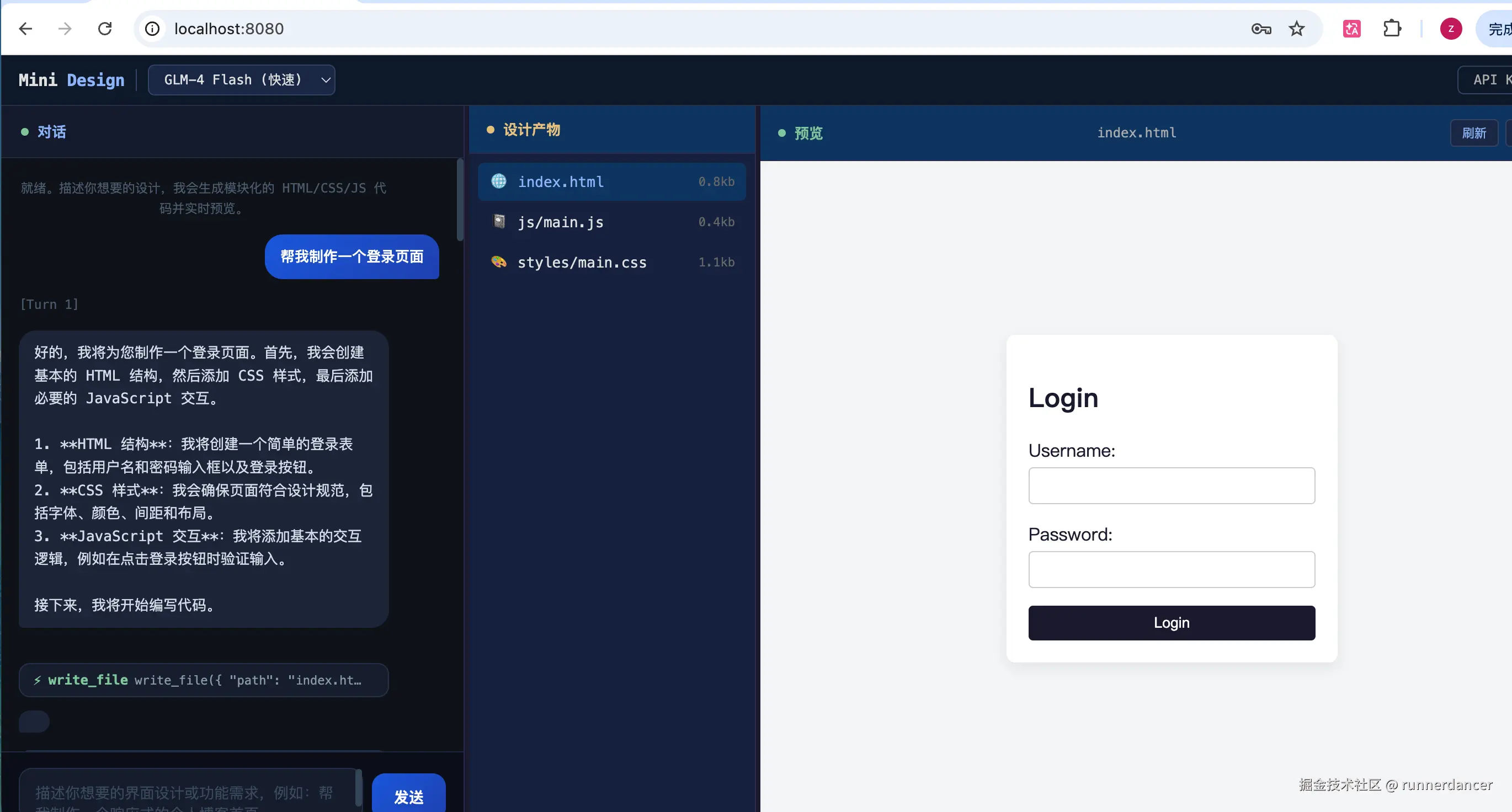 - "帮我创建一个登录页面" → 写入完整 HTML + CSS + JS
