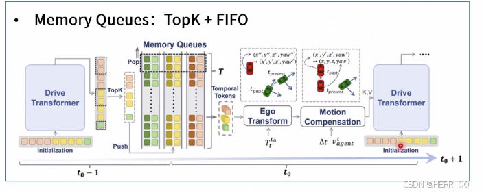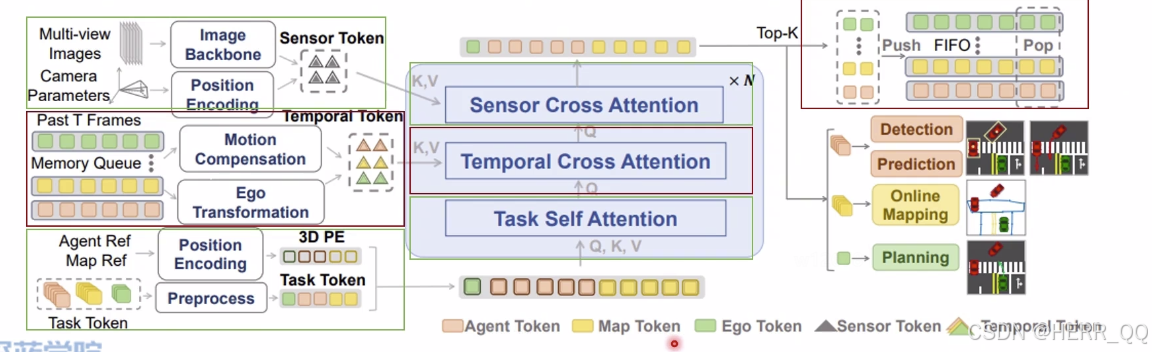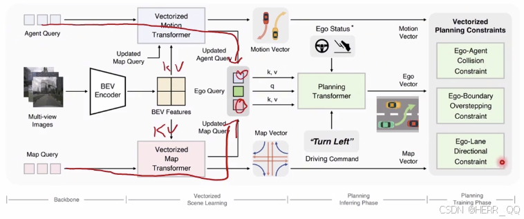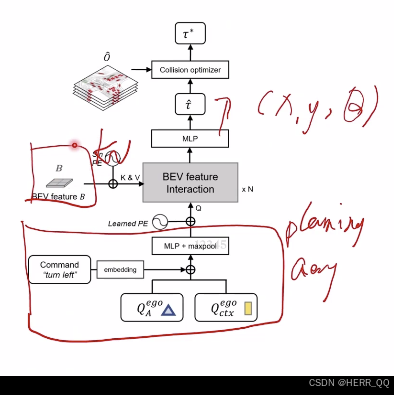 TrackFormer(目标跟踪)和MotionFormer(轨迹预测)输出的 Ego Query。这相当于让自车携带了当前对全局环境的感知与多模态意图信息。 - 导航指令:将具体的驾驶意图(如左转、直行、右转)编码为可学习的嵌入向量(Command encoding)。