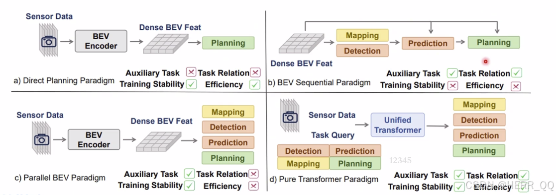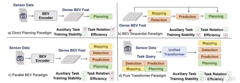 | (d) Pure Transformer*(纯 Transformer)* | 图像 → \rightarrow → BEV特征 → \rightarrow → Unified Transformer + Task Queries → \rightarrow → 所有任务交互融合 → \rightarrow → Planning大一统架构。 | ✅ 有*(统一监督)* | ✅ 强*(Query间直接交互)* | ✅ 高*(端到端可微分)* | ✅ 极高*(全局优化,避免冗余)* | 未来主流代表架构如 VAD、DriveTransformer 等,实现全局最优决策。 |