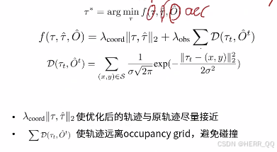 - 碰撞避免项 ( D ( τ t , O ^ t ) D(\tau_t, \hat{O}^t) D(τt,O^t)) :这一项对应手写标注的 λ o b s \lambda_{obs} λobs。它计算轨迹点 τ t \tau_t τt 与占用区域 O ^ t \hat{O}^t O^t 之间的代价(通常基于高斯分布的距离惩罚),强制规划的轨迹必须远离任何可能被占用的网格区域。