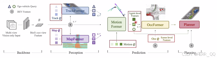 -都是从BEV feature 里面拿到 track Q 动态障碍物感知, mapQ 静态, motion 预测物体运动 以及 occ ,都拿到之后做一个planner