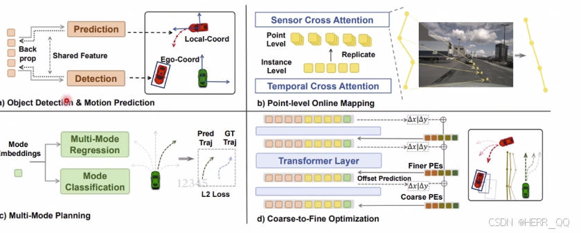 - 这两部分通过 MLP 和多层感知机结合,加上位置编码,形成了最终指导自车运动的"规划查询"。