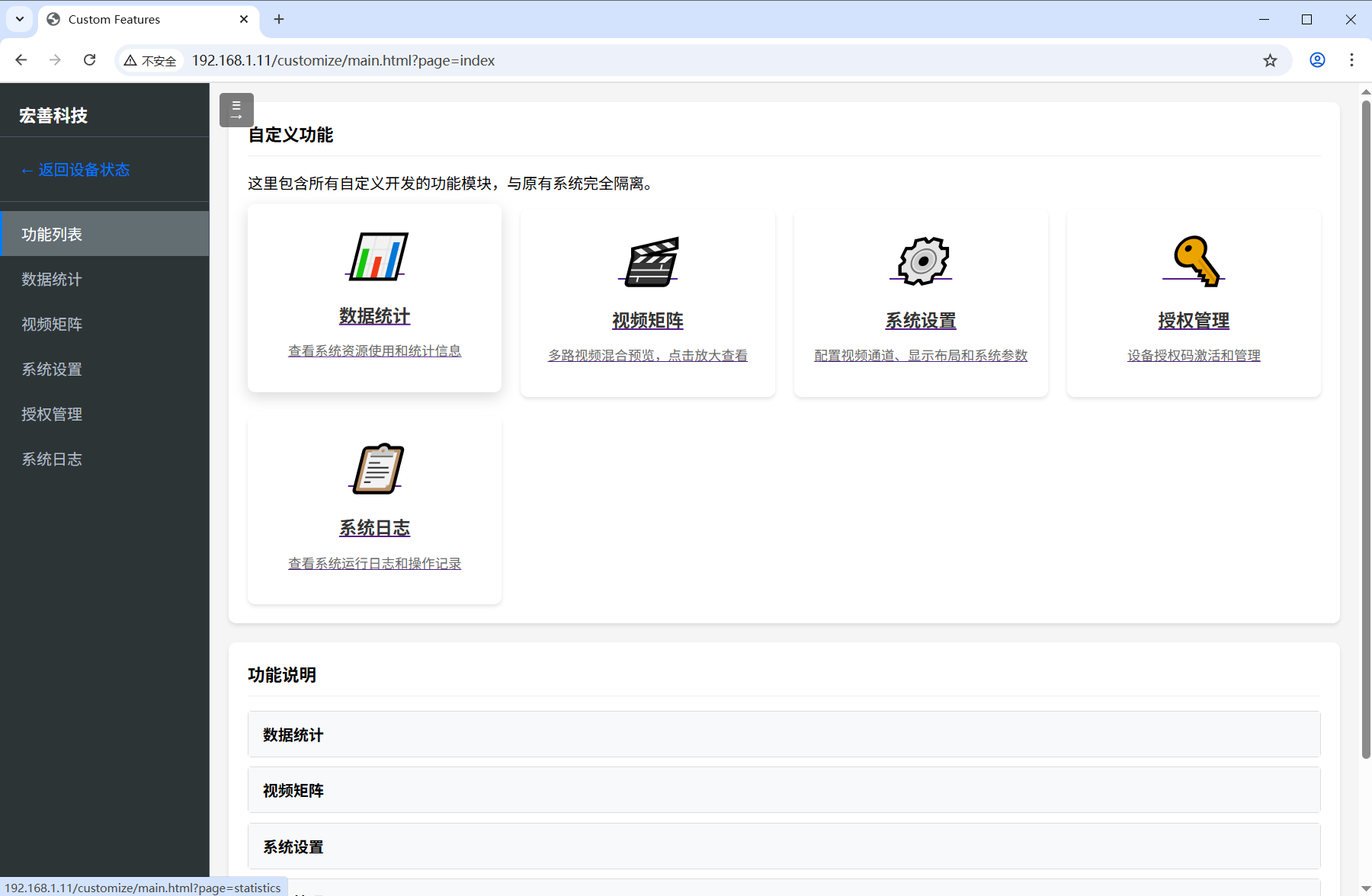 系统采用模块化设计,将数据统计、视频矩阵、系统设置、授权管理、系统日志五大核心功能整合在一个简洁直观的界面中。点击即可进入对应功能模块,操作简单便捷。所有自定义开发的功能模块与原有系统完全隔离,确保系统稳定性和安全性。