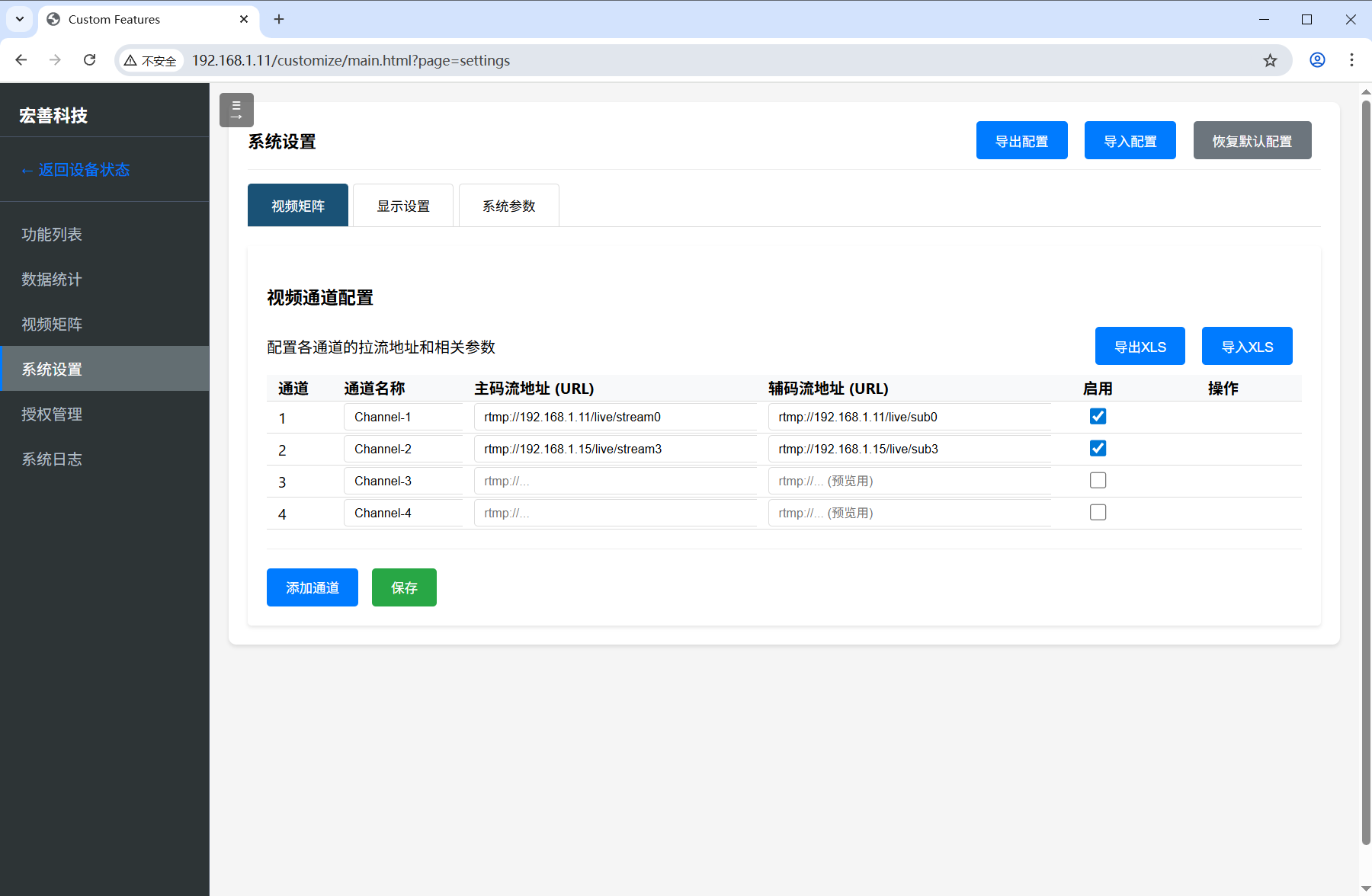 通道配置 RTMP推流 导入导出 参数管理