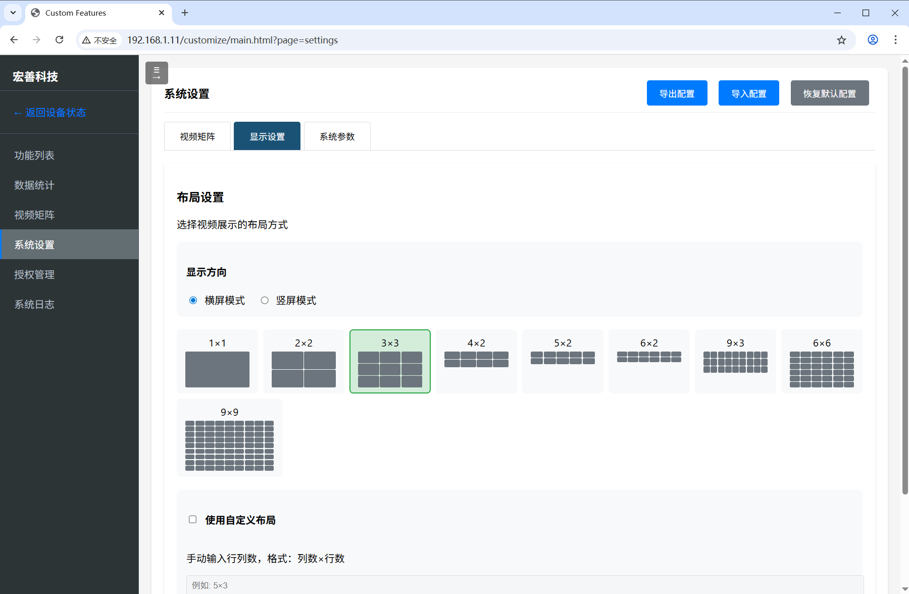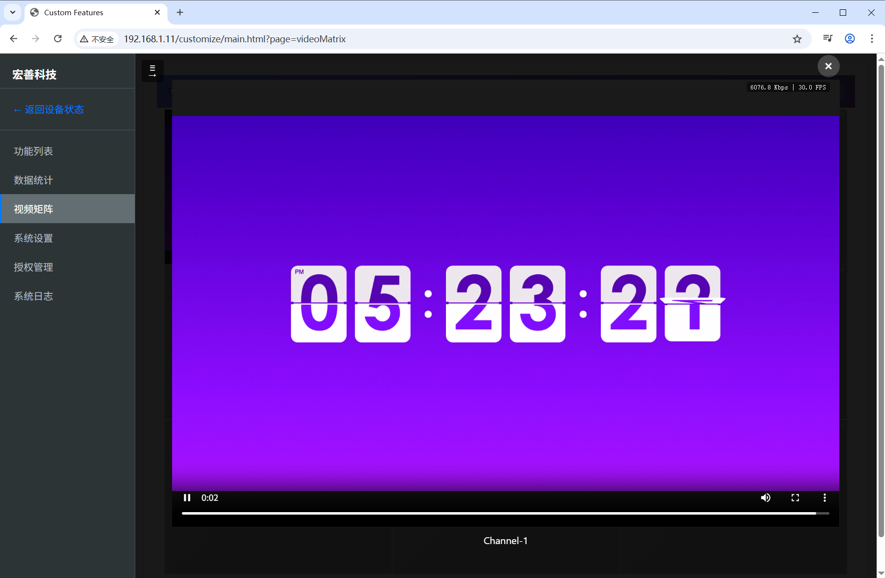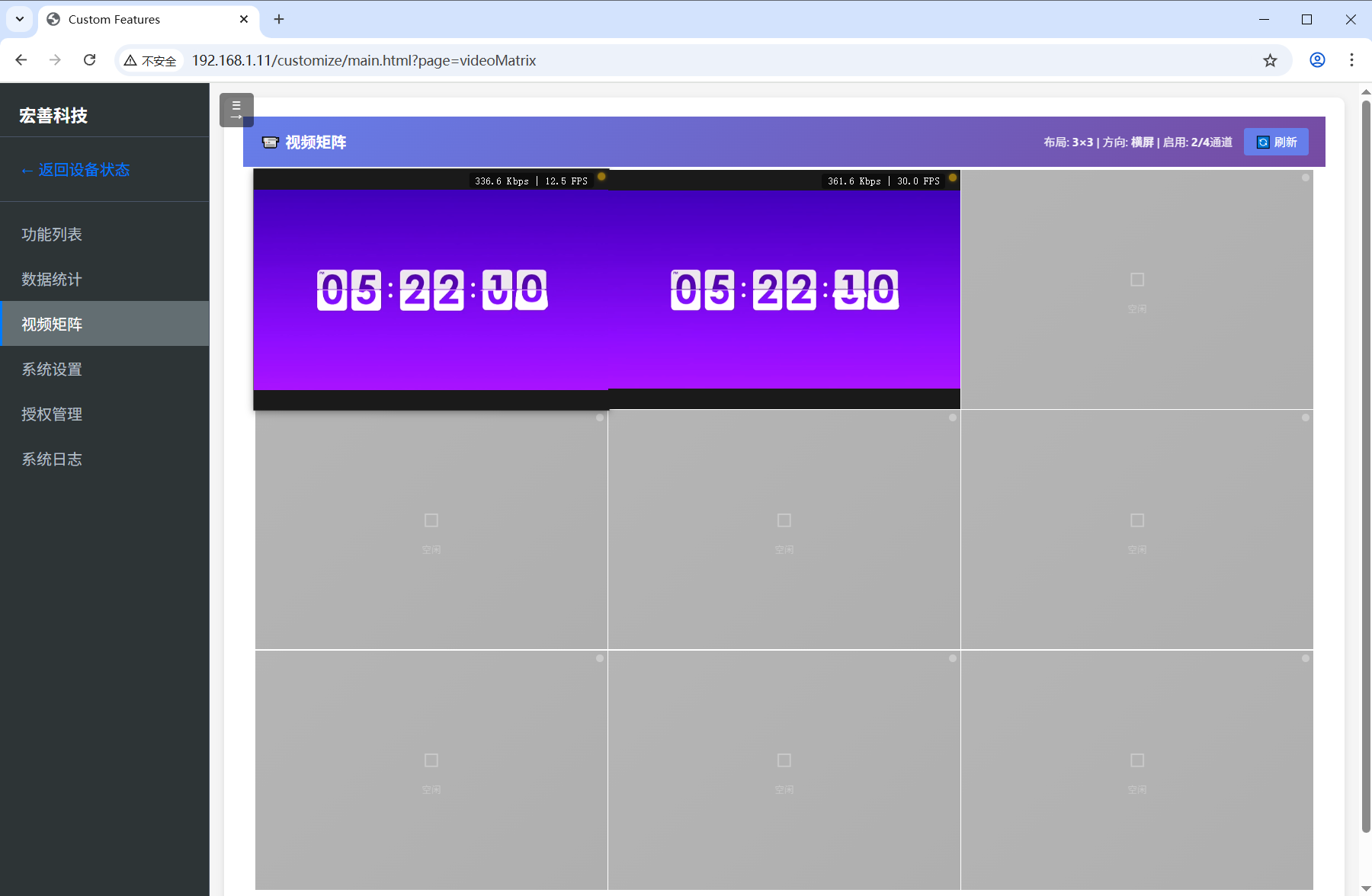 视频矩阵功能支持多路视频信号的实时预览,采用3×3网格布局,可同时查看9路视频画面。并支持多种布局方式,界面上方显示当前布局模式、方向及启用通道数量。每个视频窗口实时显示码率和帧率信息,支持点击放大查看单路视频的详细画面。