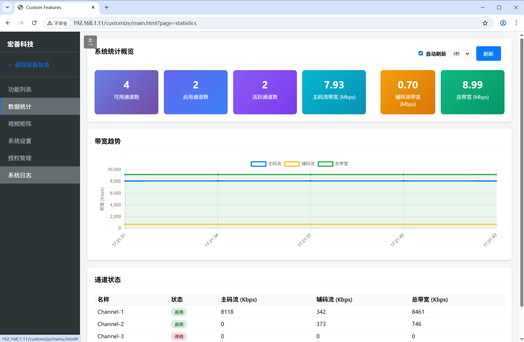数据统计中心提供系统资源使用情况的实时监控,包括可用通道数、启用通道数、活跃通道数、主码流带宽、辅码流带宽等关键指标。通过直观的数字卡片和带宽趋势图表,帮助管理员快速掌握系统运行状态。通道状态列表详细展示每个通道的主码流和辅码流带宽使用情况。