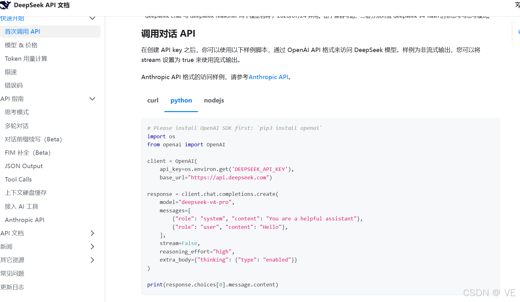 client = OpenAI(api_key="你的API Key", base_url="https://api.deepseek.com")