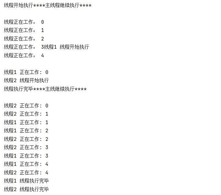 运行这段代码,你会发现 "线程 1" 和 "线程 2" 交替输出内容,主线程也不会等待子线程完成才执行后续代码,这就是多线程的 "并行" 特性 ------ 多个线程在 CPU 中交替执行,看起来像是同时运行。
