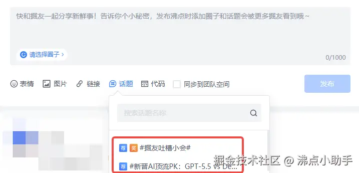 - 发布沸点,带上专属话题: #掘友吐槽小会#
