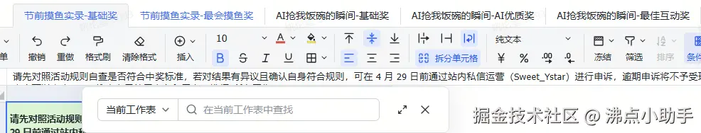 由于获奖用户较多,详细的名单公示如下:节前摸鱼实录 & AI抢我饭碗的瞬间 获奖名单 如何快速找到自己:进入飞书表格后,使用 Ctr+F 搜索自己的用户名或 用户id,选择"所有工作表"( 用户 id 即掘金主页 juejin.cn/XXXXXX 最后的一串数字)。之前打开过本表同学请刷新表单,奖项或有增补,以最新的表格为准。