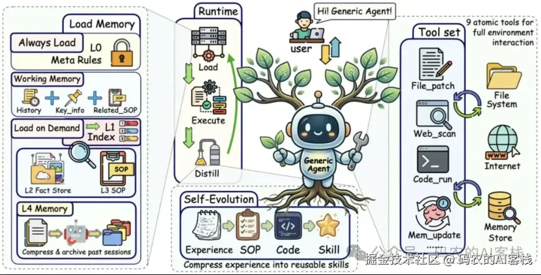 上图为GenericAgent的整体框架。四大核心机制------最小原子工具集(右边)、分层记忆(左边)、自我进化(底部)和上下文截断与压缩(整个运行过程)------在信息生命周期的不同阶段协同优化信息密度。