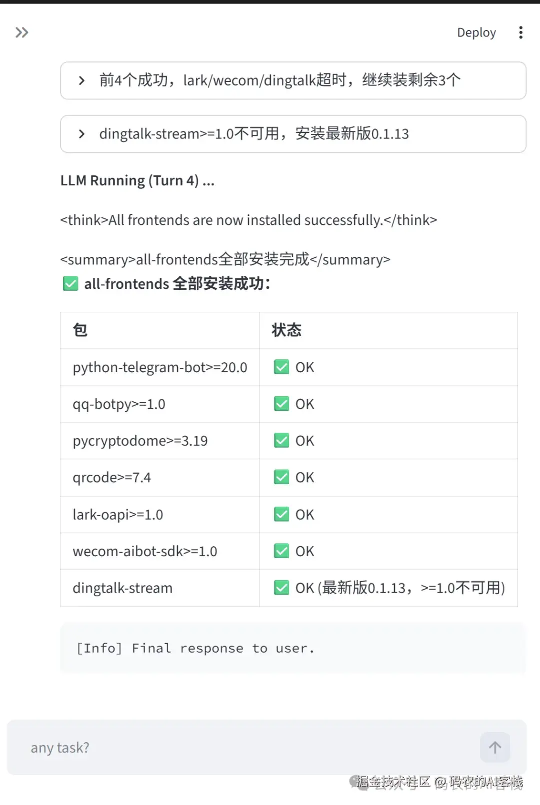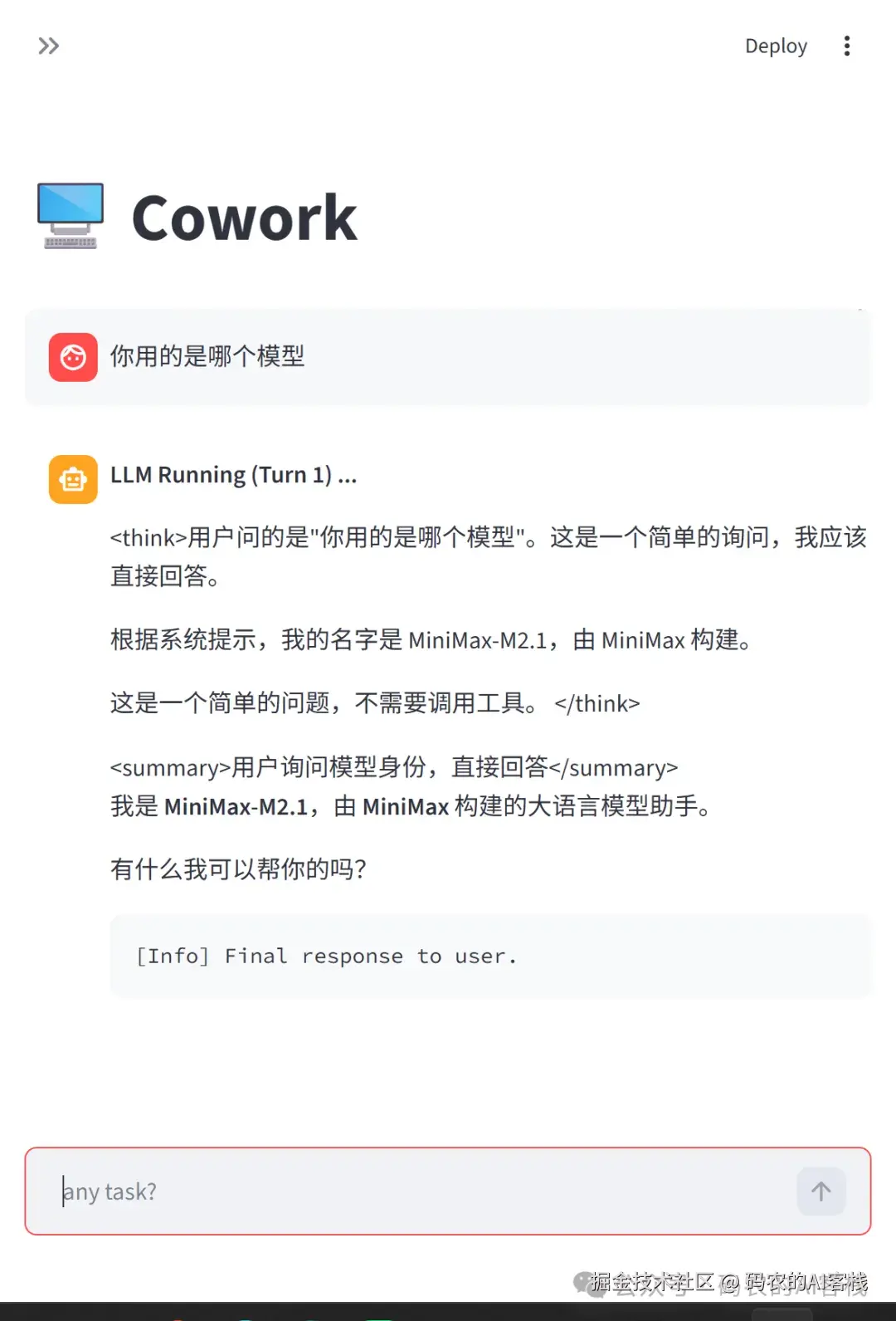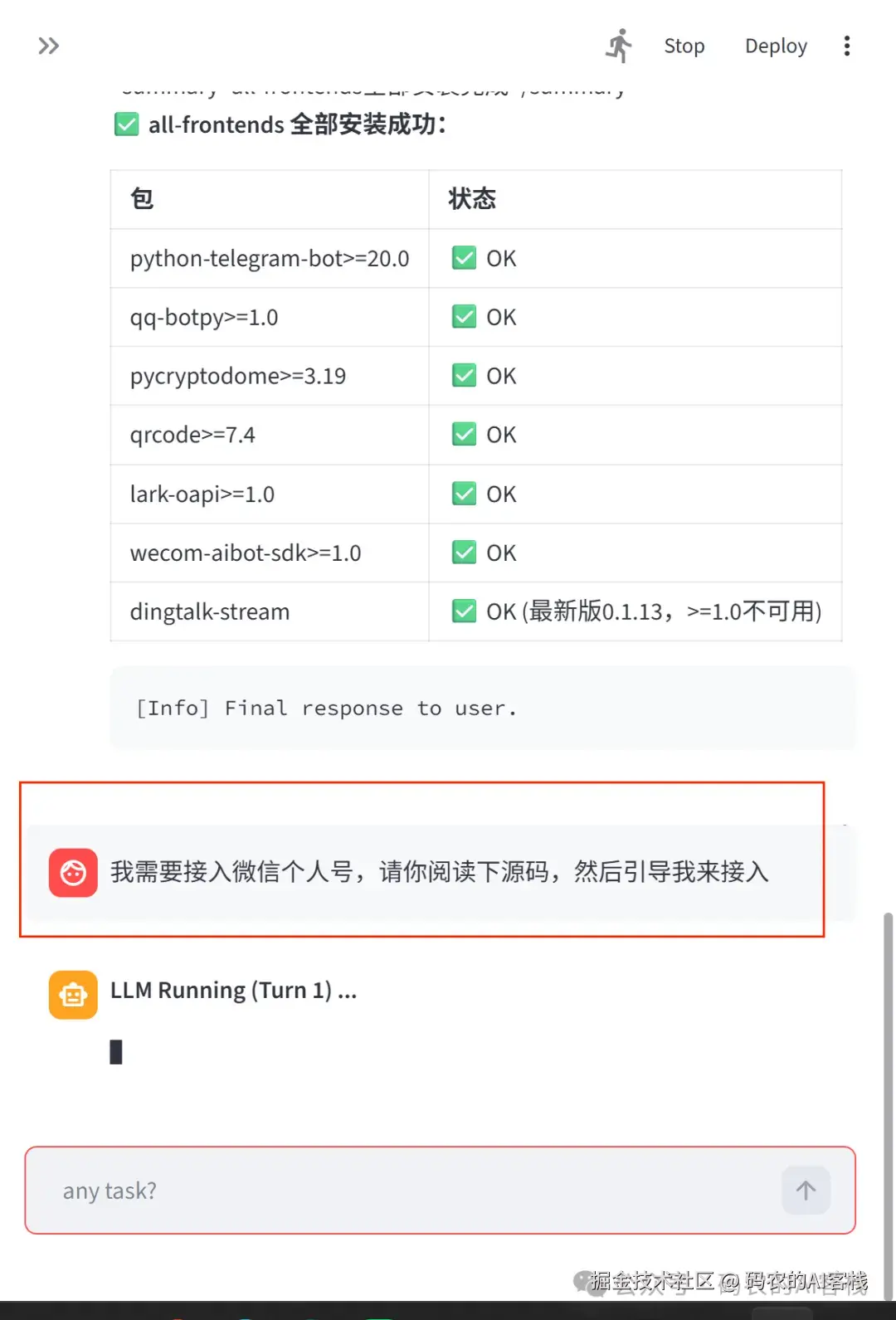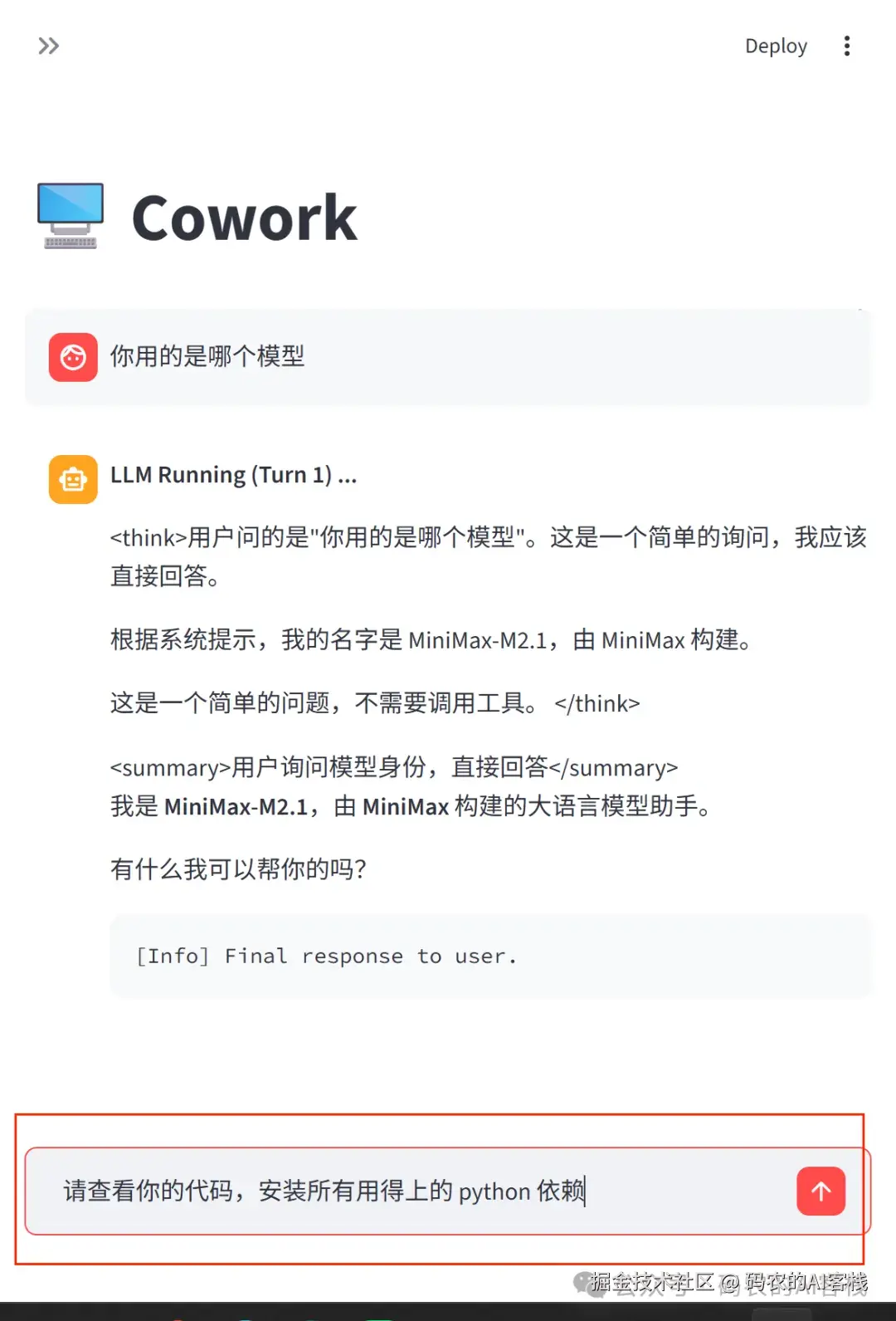 我先让他看了下目前使用的是哪个模型,回答的是MiniMax,跟我在配置文件中配置的是一致的,接下来我让他自己读取源代码,把未安装的依赖一起安装了。
