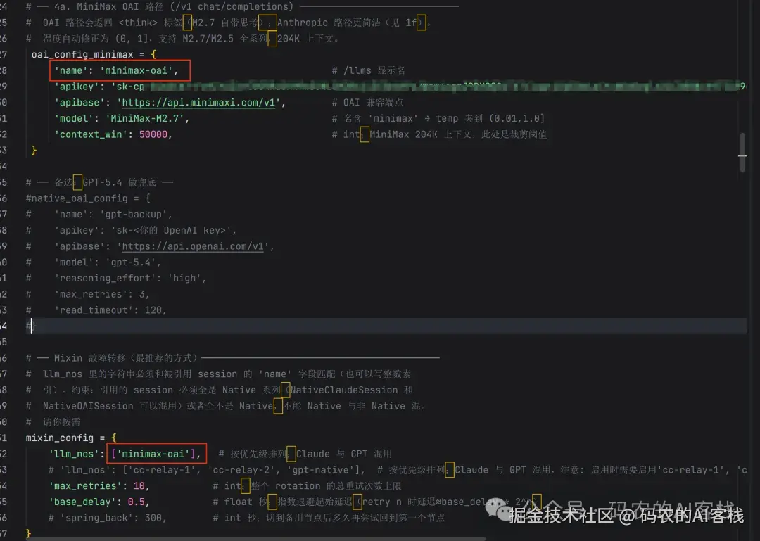 如果你有多个大模型配置,都配置完之后,一定记得要在mixin配置中的llm_nos里,配置好模型name,我这里是minimax-oai。因为GA这边,会根据mixin中的配置,当第一个默认模型出现调用失败(比如额度用完,调用失败等),会自动切换到备选模型。小编这里只有一个,所以没有添加备选,