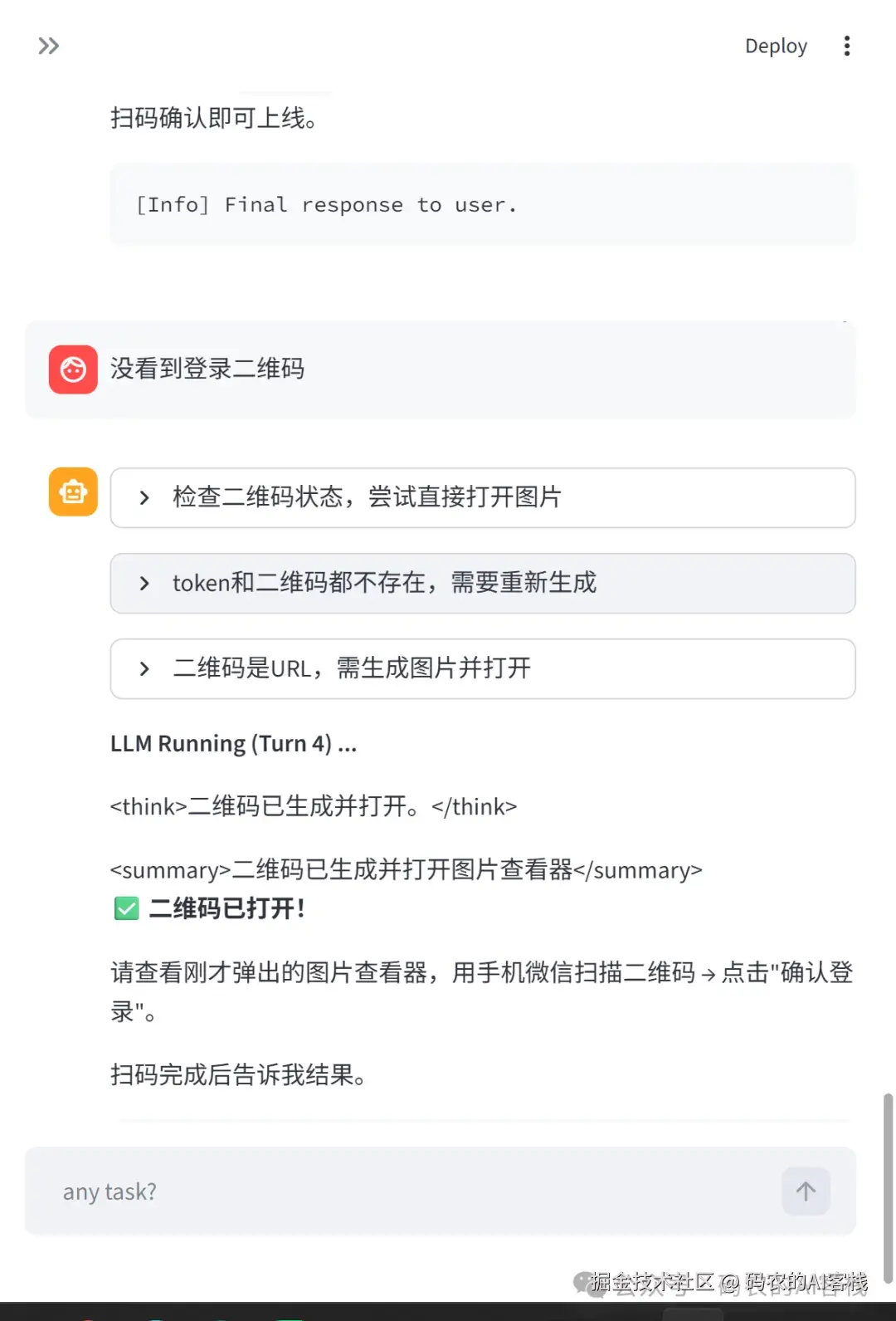 继续跟他说,可以开始扫码登录。然后出问题了,第一次的时候在终端没有出现二维码,然后继续反馈给他,第二次,他直接打开本地的图片查看器,把二维码输出了