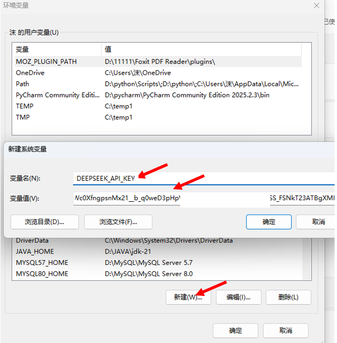 然后我们需要将我们获取到的这个API key配置到我们的系统环境变量里面,这样子代码里面就不要去写我们的API key了