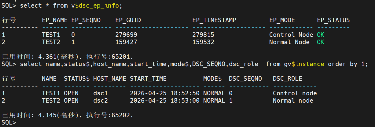 select name,status$,host_name,start_time,mode$,DSC_SEQNO,dsc_role from gv$instance order by 1;
