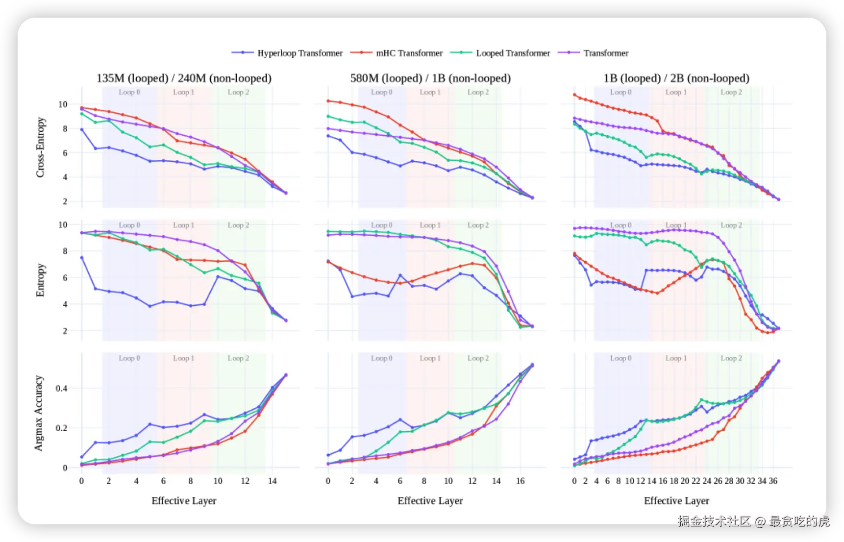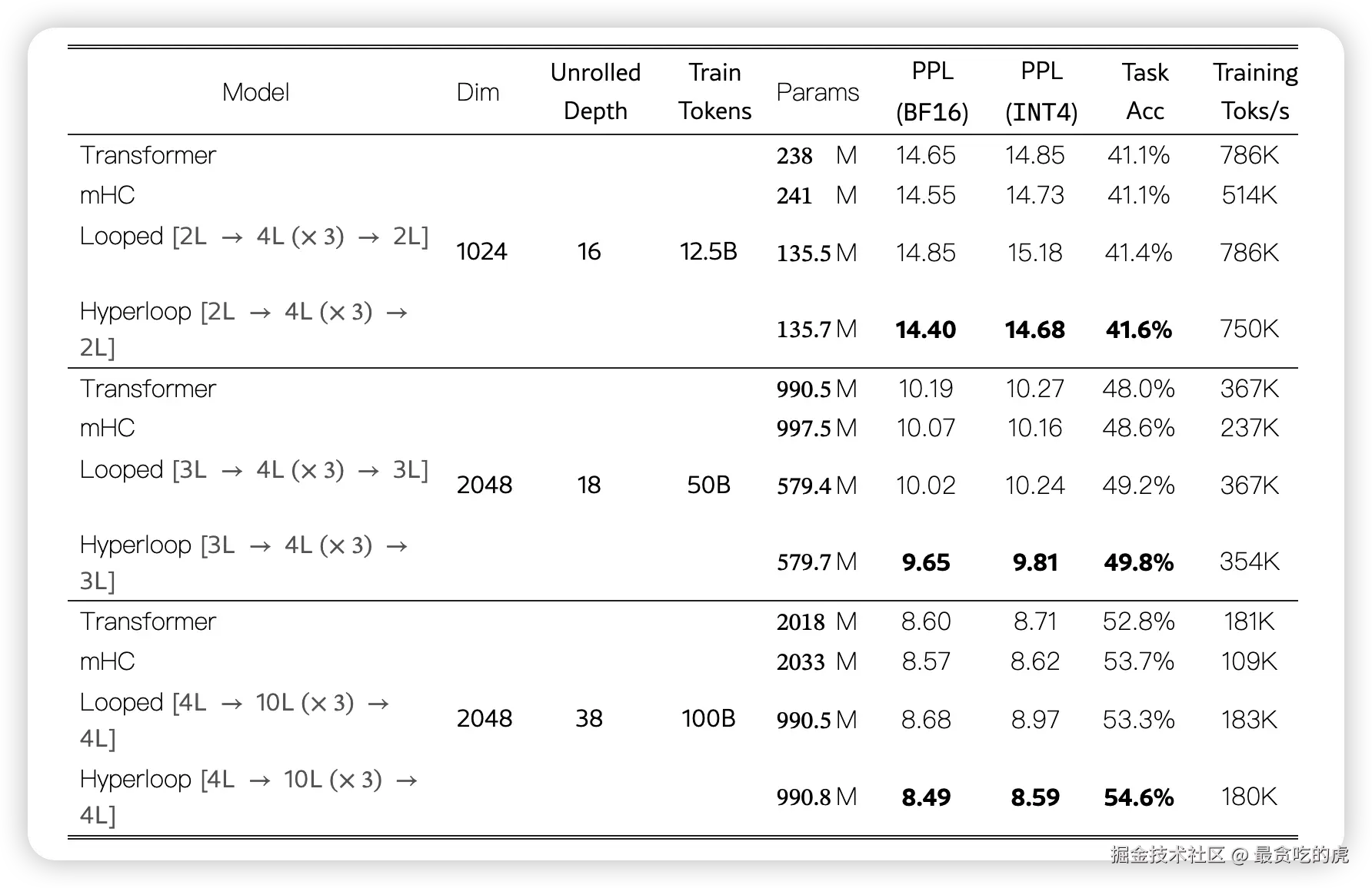 Hyperloop Transformer 用更少参数,效果反而比普通 Transformer、Looped Transformer、mHC Transformer 更好。
