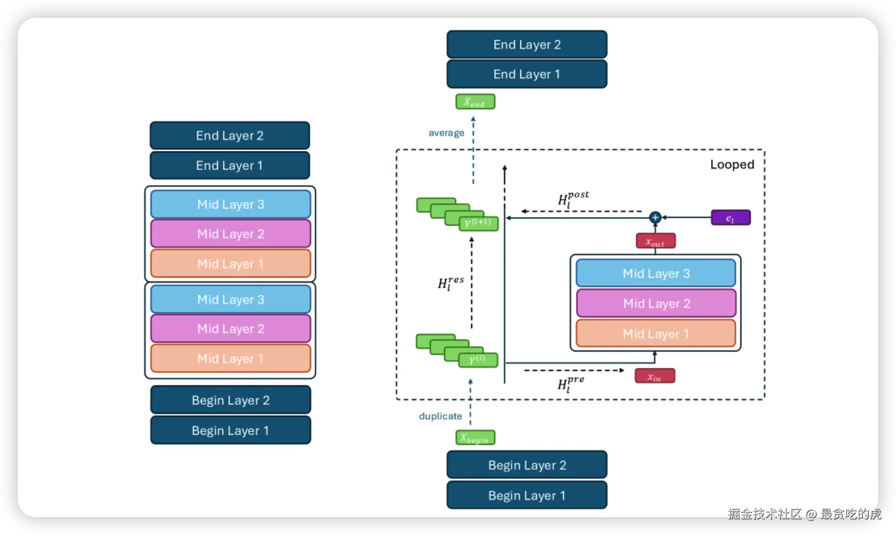 它把整个模型分成三段:begin block、middle block、end block。begin block 负责把输入表示带入模型,middle block 负责主要计算,end block 负责输出前的收尾。真正被循环执行的,只有中间的 middle block。论文称这种方式为 middle cycle 策略。