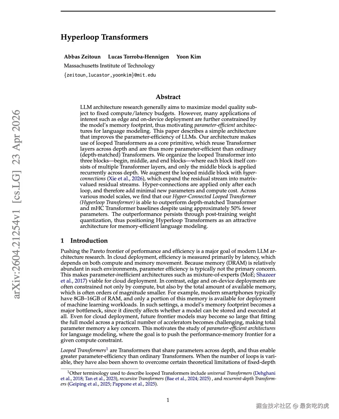 MIT 这篇《Hyperloop Transformers》研究的正是这个问题。论文提出了一种参数更省的 Transformer 架构,目标是在相近计算路径下,用更少参数获得接近甚至更好的语言建模效果。论文作者来自 MIT。