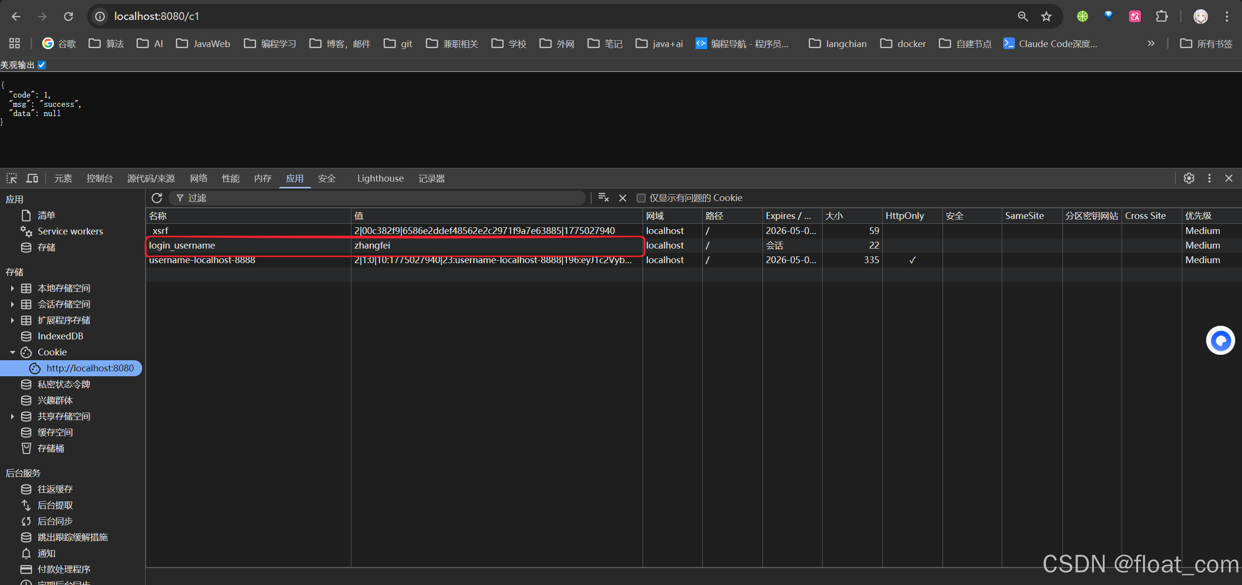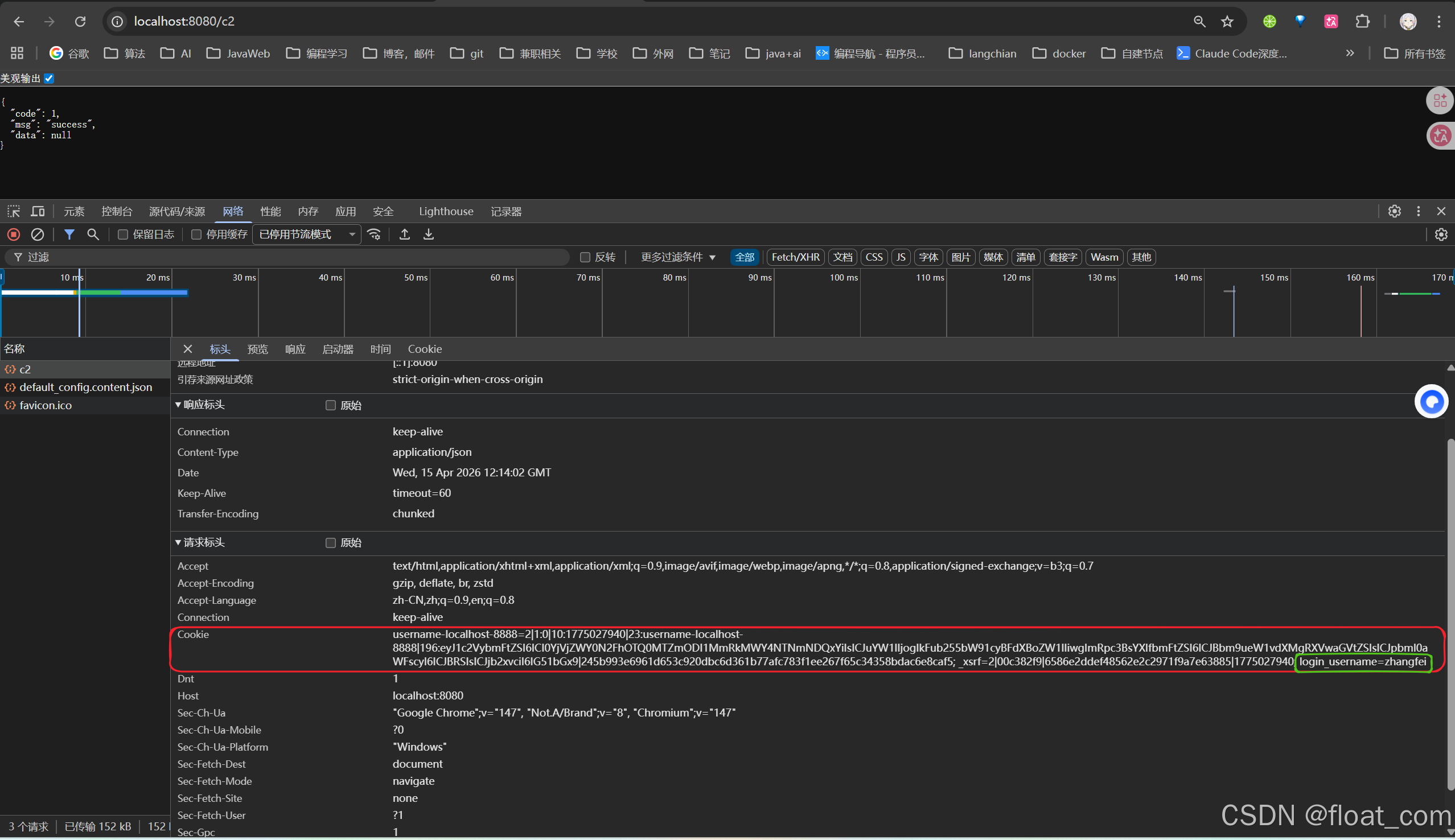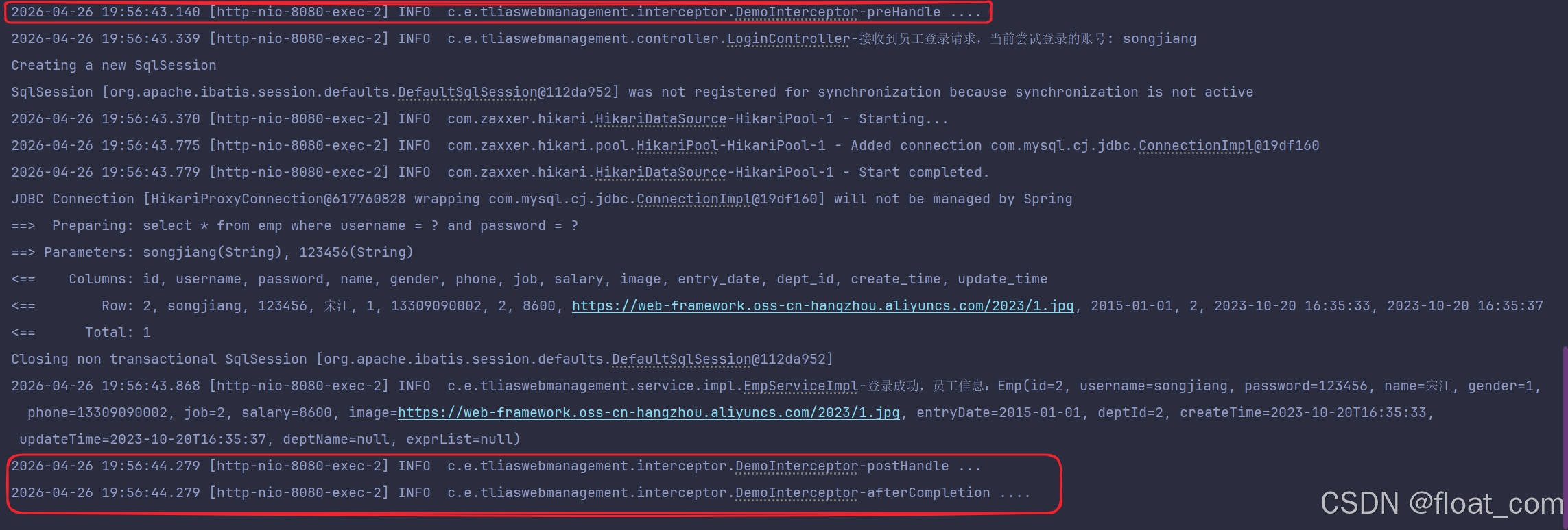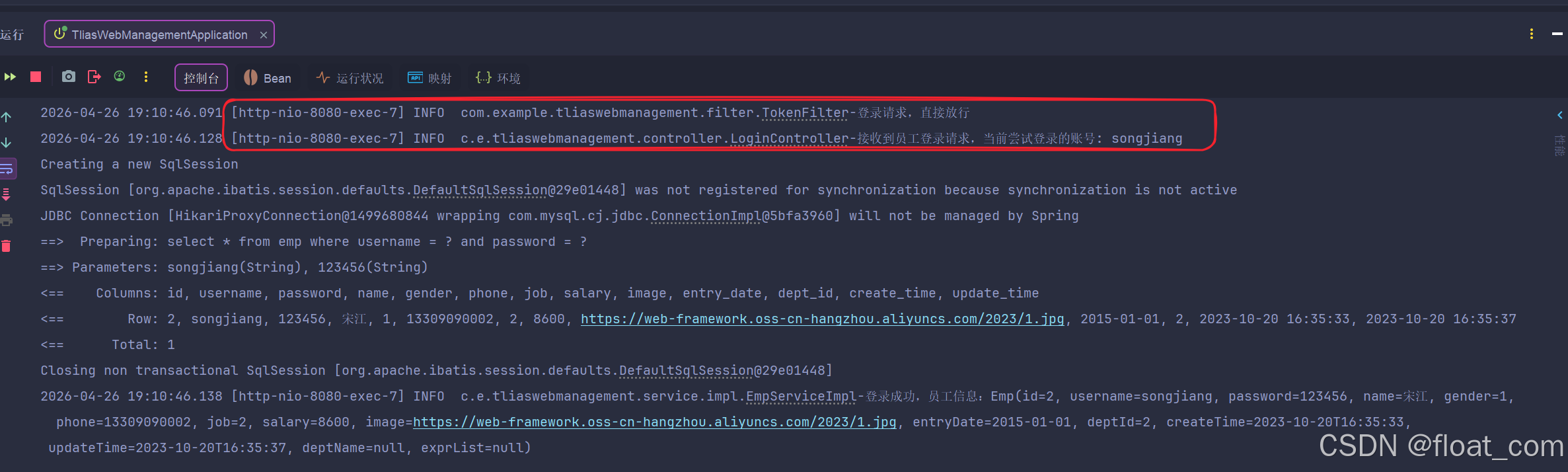 /login请求,得益于excludePathPatterns白名单配置,请求被直接放行并成功下发 Token。